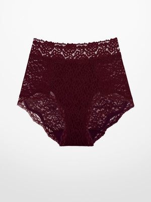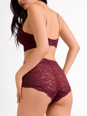 This high-rise lace shortie features a power mesh front panel that delivers light, comfortable control—creating a subtle tummy tuck effect without squeezing or digging. The waistband and leg openings are soft and smooth, so they won’t roll, cut in, or pinch your skin. In the back? No restriction—just flattering coverage and stretch lace that lets your natural curves shine.