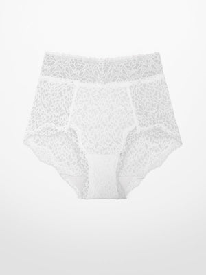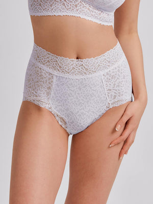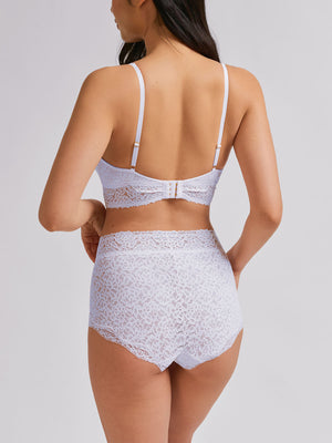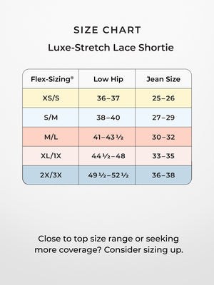 This high-rise lace shortie features a power mesh front panel that delivers light, comfortable control—creating a subtle tummy tuck effect without squeezing or digging. The waistband and leg openings are soft and smooth, so they won’t roll, cut in, or pinch your skin. In the back? No restriction—just flattering coverage and stretch lace that lets your natural curves shine.